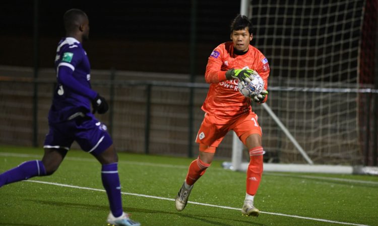 กวินทร์ ธรรมสัจจานันท์ ผู้รักษาประตูของโอเอช ลูเวิน เฝ้าเสาให้กับทีมสำรองในเกมลีกที่เปิด คอร์บีคดาร์…