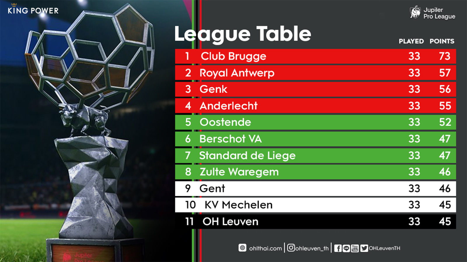อันดับ 11 โอเอช ลูเวิน 45 คะแนน (เหย้า พบ วาสแลนด์ เบเวอเรน)