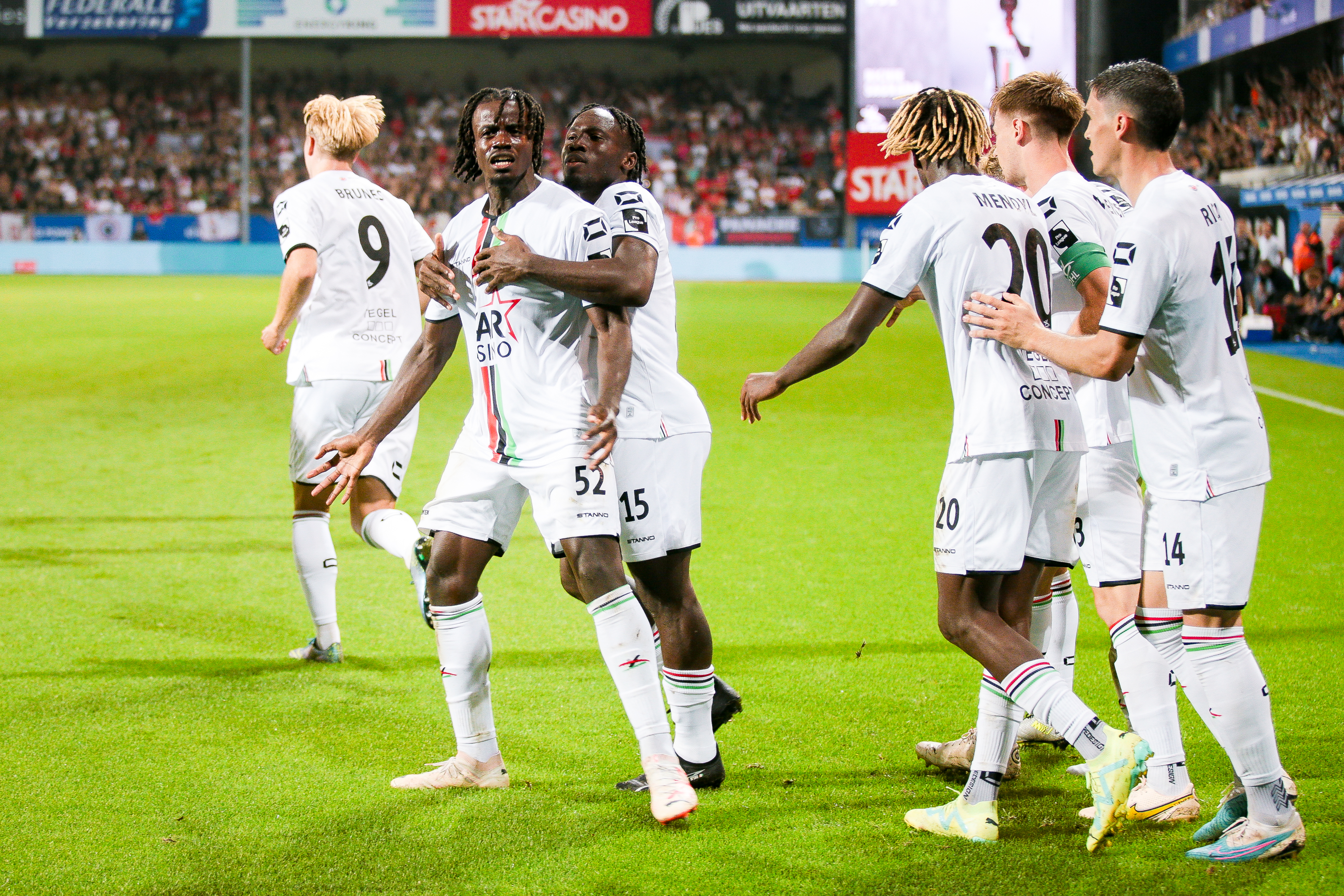 HEVERLEE, BELGIUM – AUGUST 18: The team of OH Leuven celebrates after the 1-1 goal Richie Sagrado of OH Leuven during the Jupiler Pro League match between OH Leuven and Royal Antwerp FC at the King Power at Den Dreef Stadion on August 18, 2023 in Heverlee, Belgium. (Photo by Plumb Images/Getty Images)