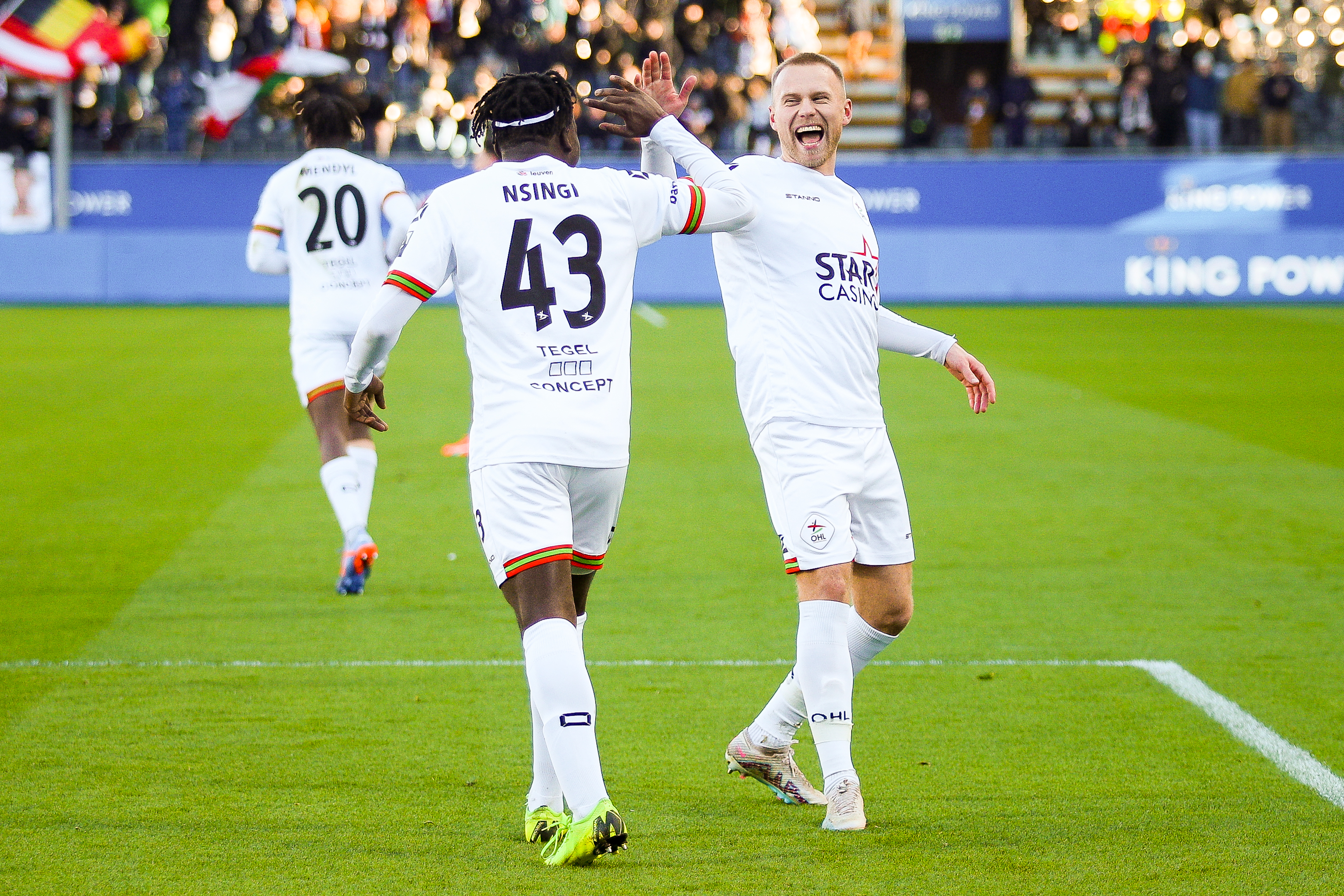HEVERLEE, BELGIUM – FEBRUARY 26: Nachon Nsingi of OH Leuven celebrates after the 1-0 penalty goal of Jon Dagur Thorsteinsson of OH Leuven during the Jupiler Pro League match between OH Leuven and Royal Antwerp FC at the King Power at Den Dreef Stadion on February 26, 2023 in Heverlee, Belgium. (Photo by Plumb Images/Getty Images)
