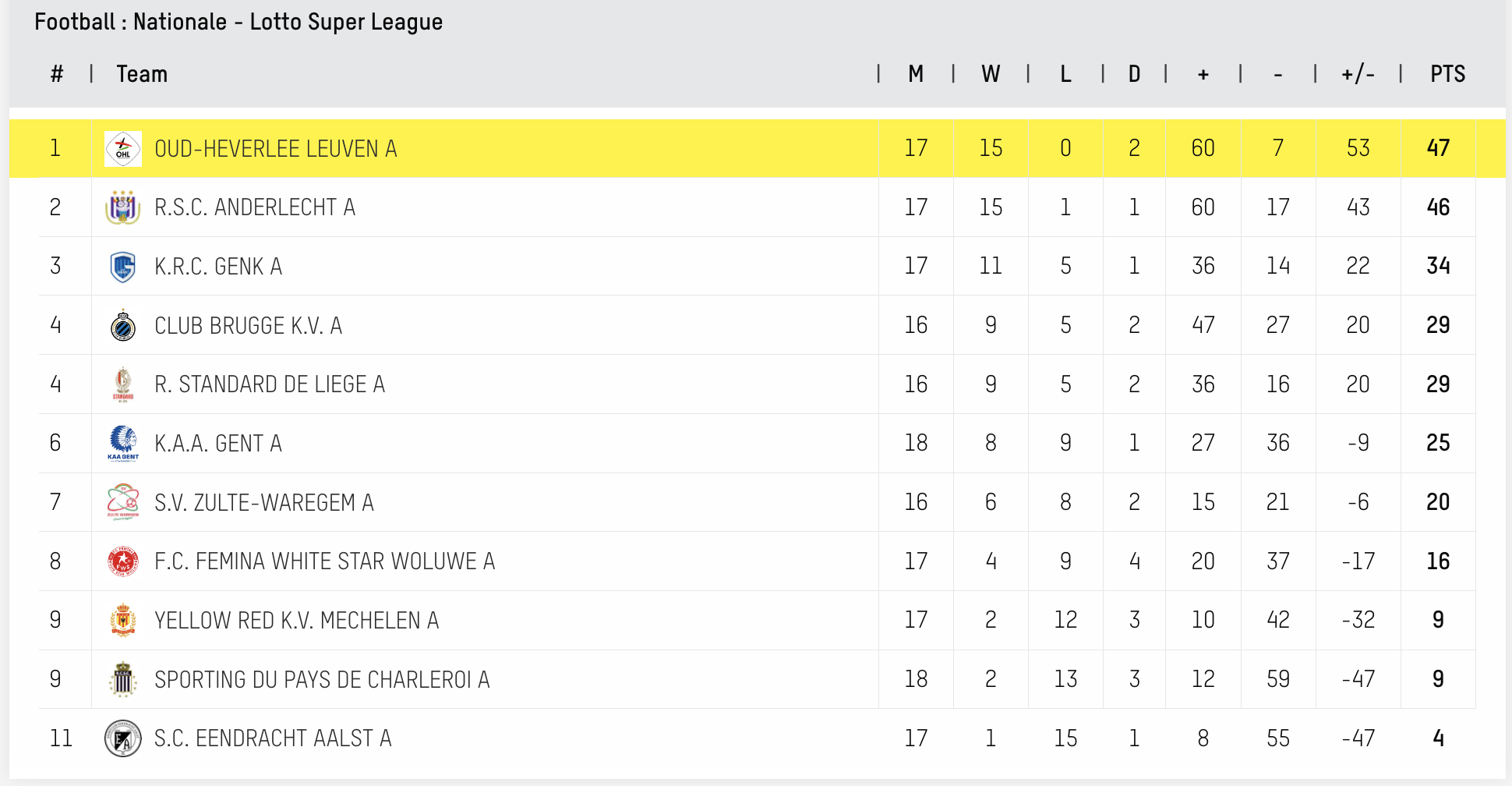 ลูเวิน ทีมหญิงยังคงนำเป็นจ่าฝูง มี 47 คะแนนจาก 17 นัด นำหน้าทีมอันดับสอง อันเดอร์เลชท์ อยู่ 1 คะแนน