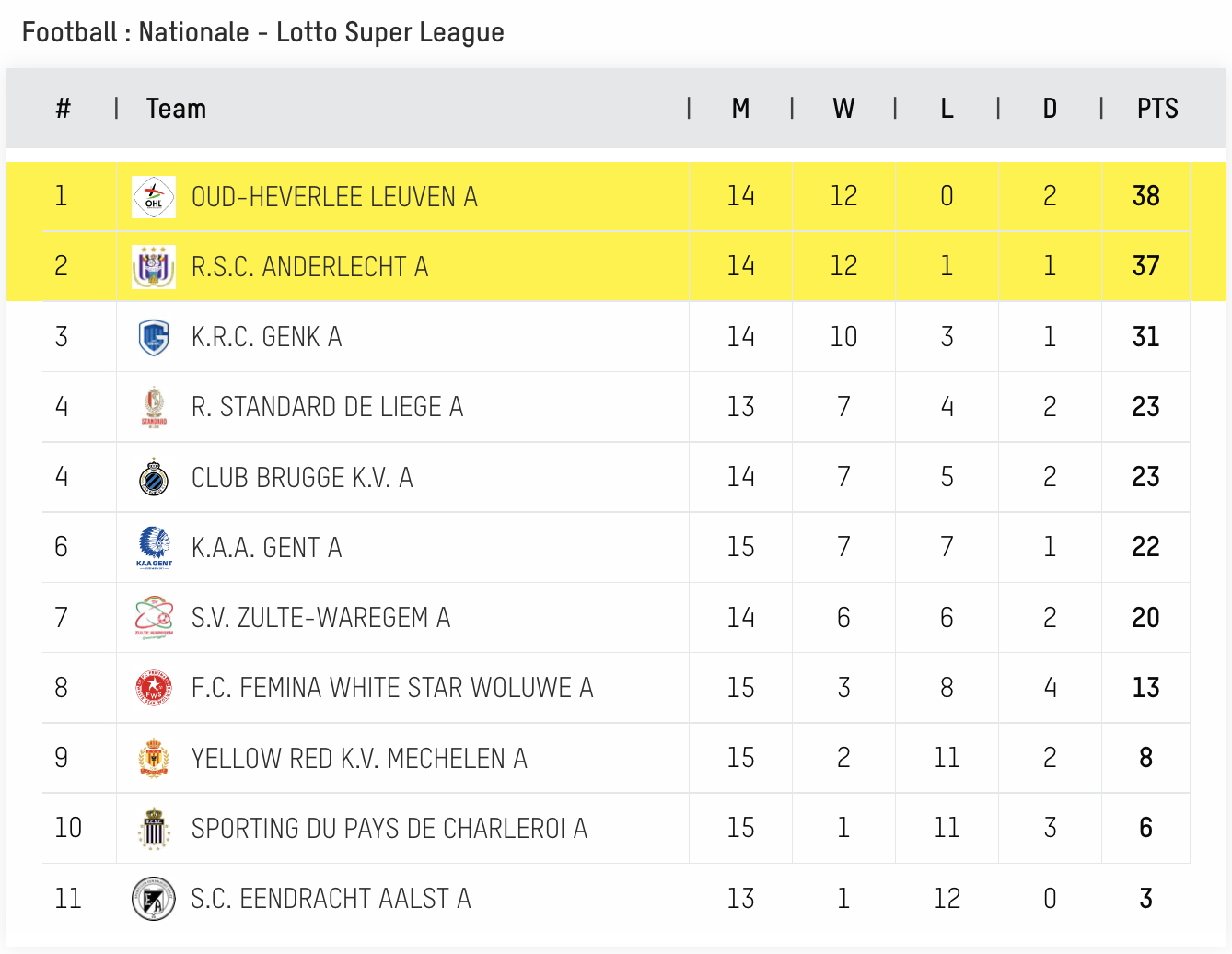 ลูเวินเก็บเพิ่มเป็น 38 คะแนนจาก 14 นัด นำเป็นจ่าฝูงของตาราง มีคะแนนเหนืออันดับสองอันเดอร์เลชท์อยู่ 1 คะแนน
